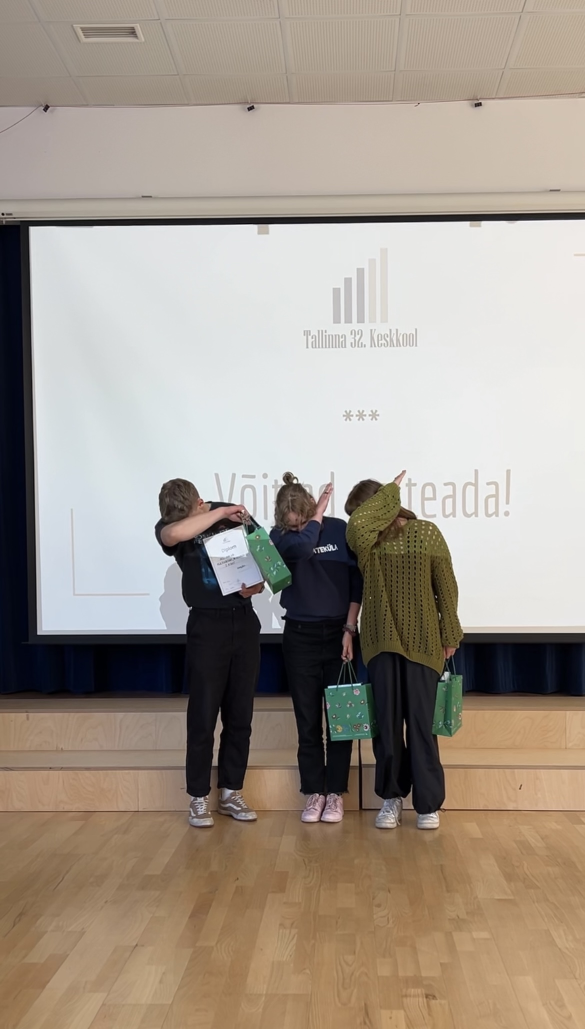 Nii tuligi žüriil teada anda, et 1. ja 2. koht lähevad tänavu jagamisele 12.a Kooloni - Mariliis Jalgma, Indrek Purge, Gerli Rehkalt - ja õpetajate esinduse - Eveli Habakuk, Kaili Malts, Aet Laast - vahel.
