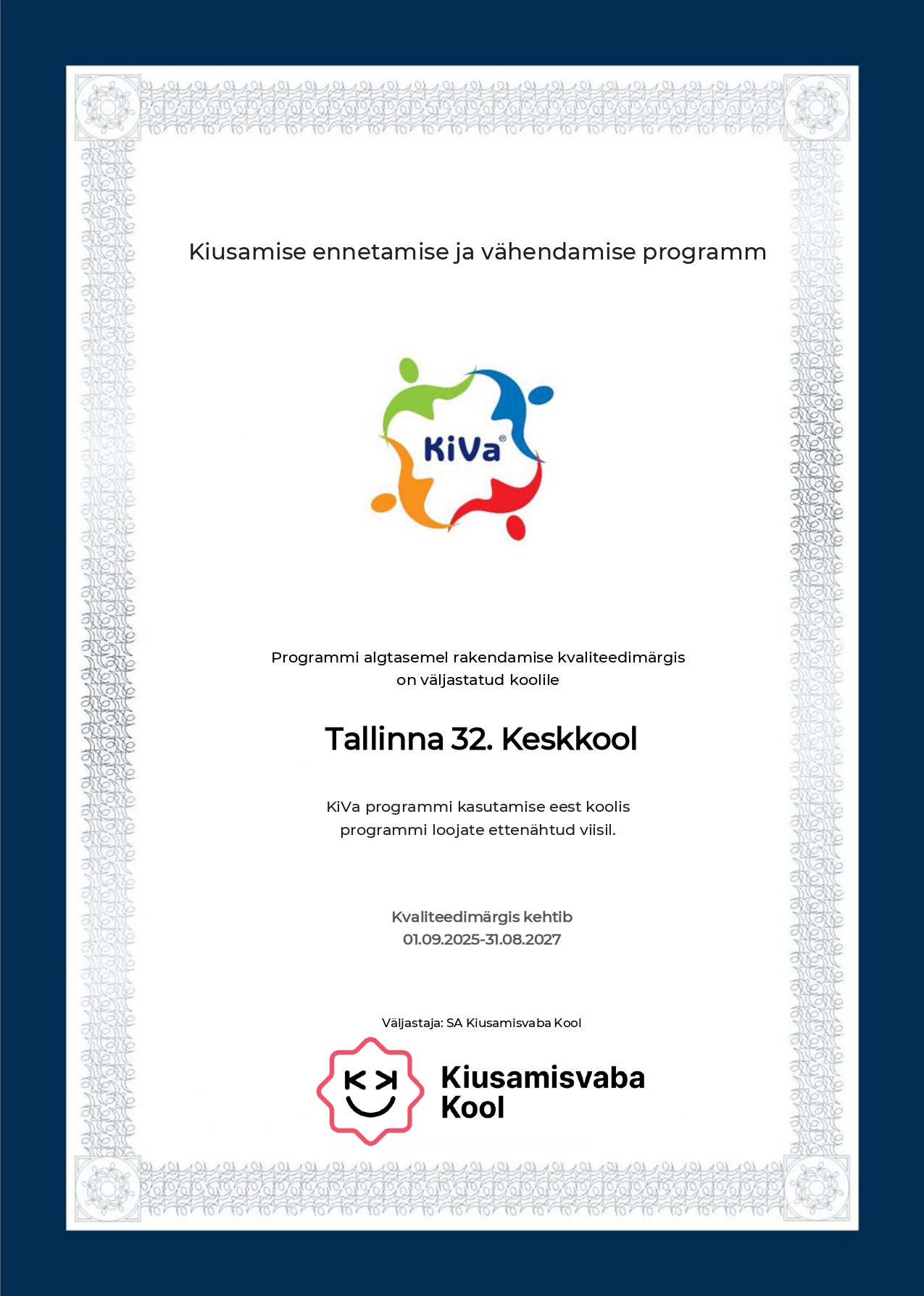 Meie koolile omistati algtaseme kvaliteedimärgis KiVa-programmi rakendamise eest.
