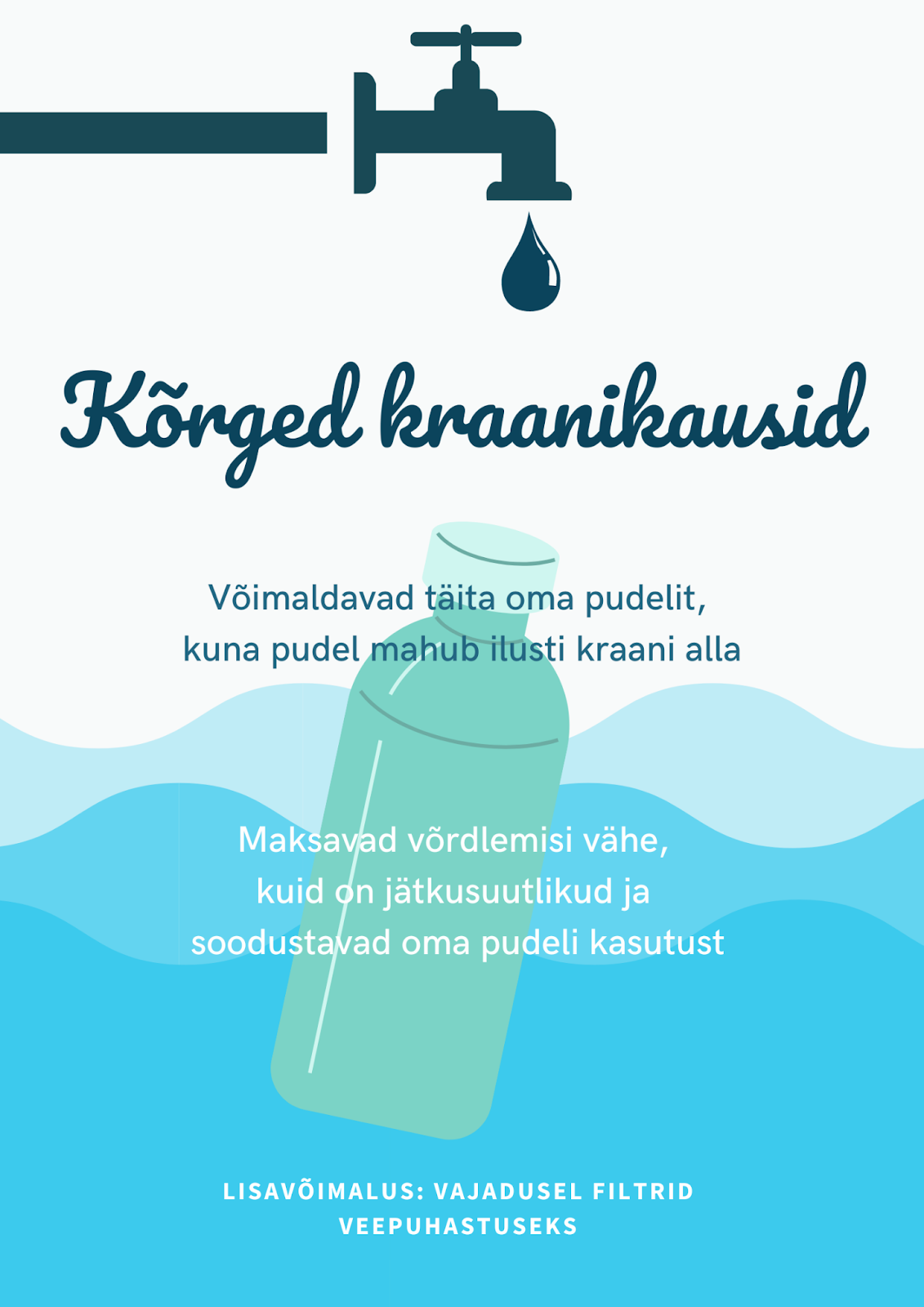 - Kõrged kraanikausid - õpilased ja ka koolitöötajad saavad oma pudeleid mugavalt kraanidest täita, sest praegu ei mahu pudelid kraanide alla. Samuti propageerib projekt oma pudelite kasutust.